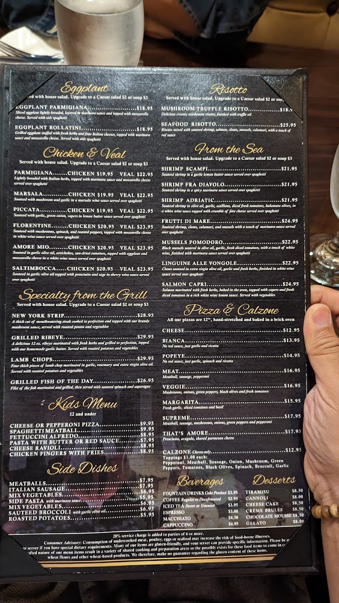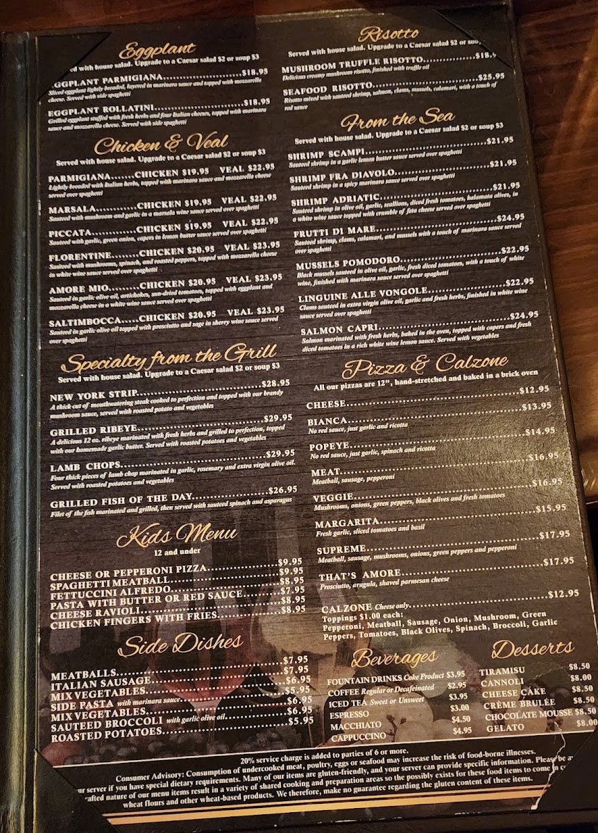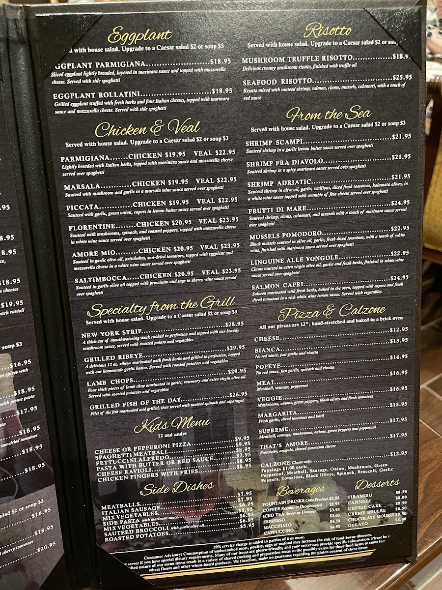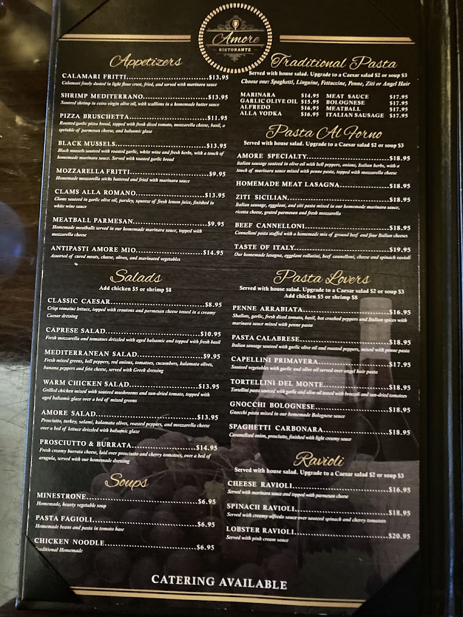 Welcome to Amore Italian Ristorante, an enchanting culinary destination located in Clermont, Florida. Our menu is a celebration of authentic Italian flavors that will transport your senses straight to Italy. For lunch, indulge in delightful appetizers such as Calamari Fritti and Shrimp Mediterrano, lovingly prepared to tantalize your taste buds. The Eggplant Parmigiana and Rollatini Eggplant showcase the rich, comforting essence of traditional Italian cuisine.