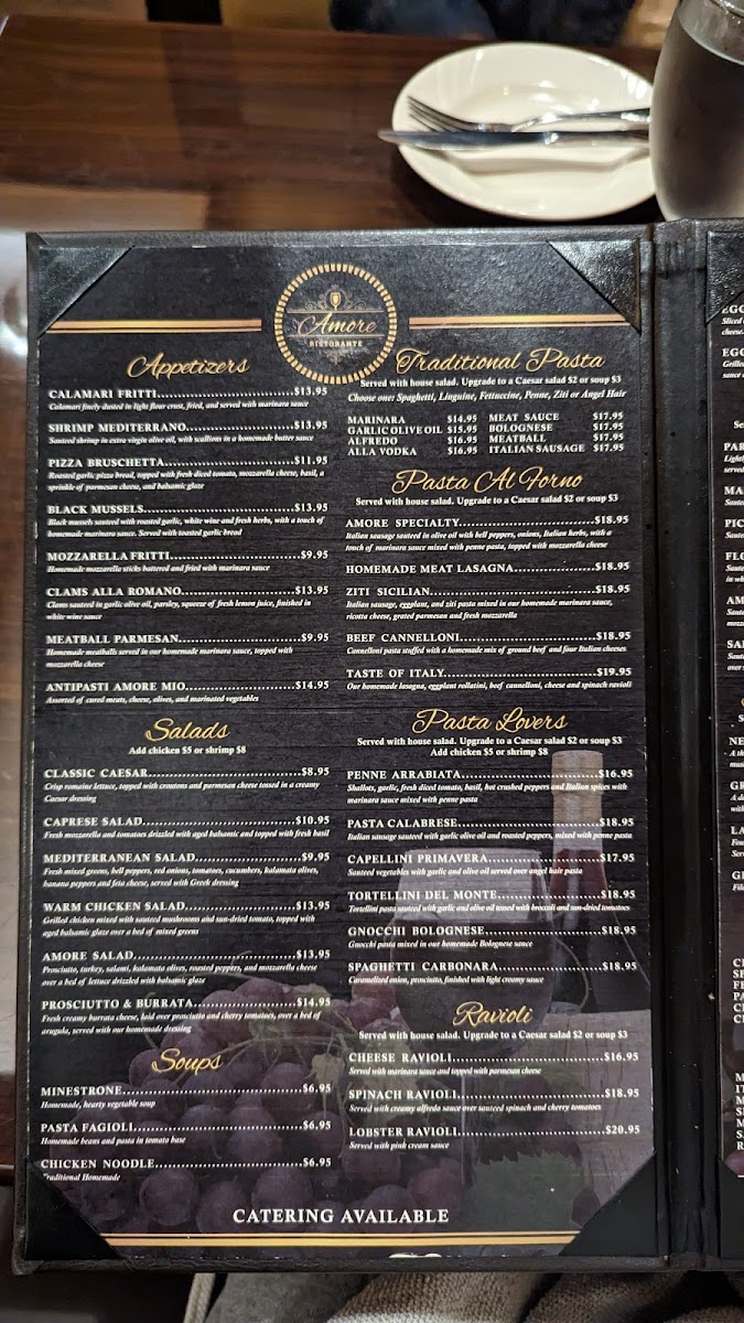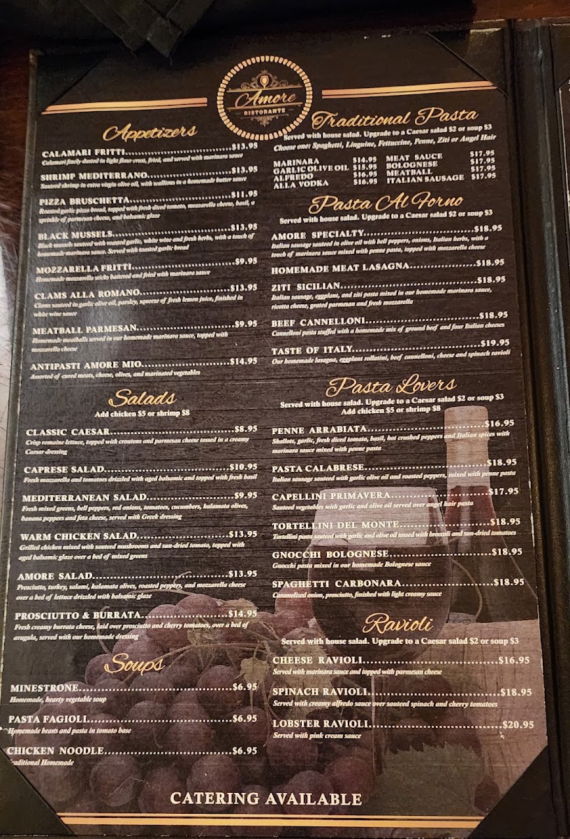 As dinner approaches, savor exquisite entrees like the perfectly grilled Ribeye Steak, paired with our Seafood Risotto for a taste of the sea. Every meal is complemented by an extensive wine list, enhancing your dining experience. Desserts like our famed Tiramisu and zesty Limoncello Cake are not to be missed. At Amore Italian Ristorante, every dish is crafted with love and care, ensuring a memorable dining experience for every occasion.